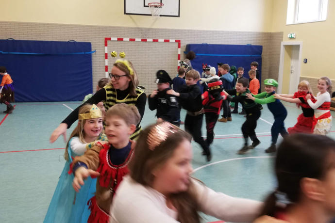 Bei unserer diesjährigen Faschingsfeier hatten wieder alle Kinder jede Menge Spaß. Viele Prinzessinnen, Ninjas, Cowboys, Indianer, Monster, Superhelden, Piraten, Hexen, Zauberer, Polizisten,… waren auf unserem Schulgelände unterwegs. Nachdem alle Klassen in den ersten beiden Stunden in ihren Klassenräumen gefeiert und auch ausgiebig gefrühstückt hatten, ging es gemeinsam in die Turnhalle, um dort zusammen weiter zu feiern.