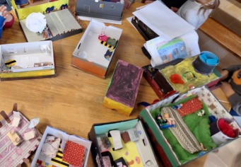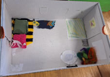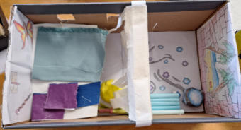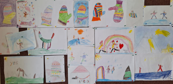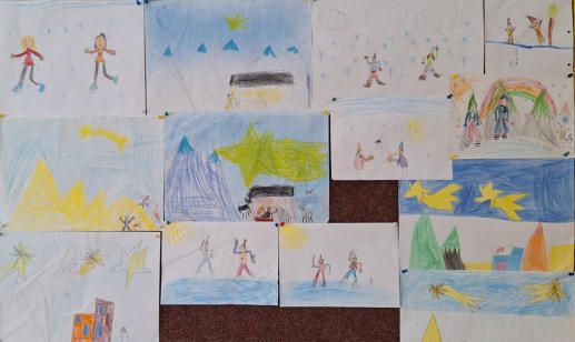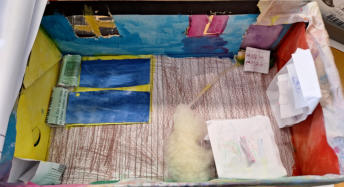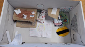 aktuelle Tageszeitung, selbst geschriebene Texte sowie gemalte Bilder, auf denen die Kinder darstellten, wie sie sich ihr Leben