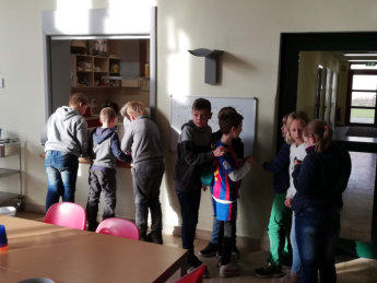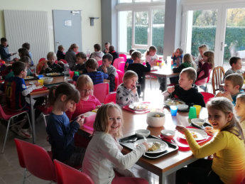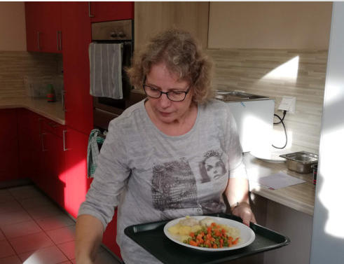 Es wird dort frisch gekocht und uns geliefert. Frau Rein übernimmt die Essensausgabe.